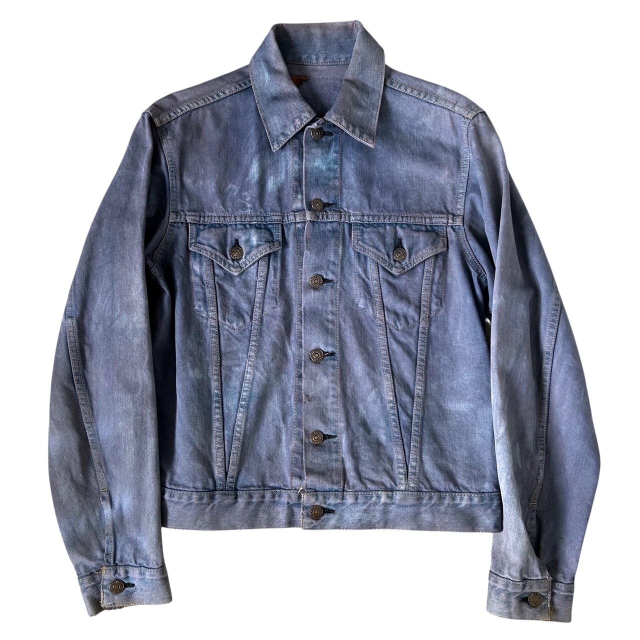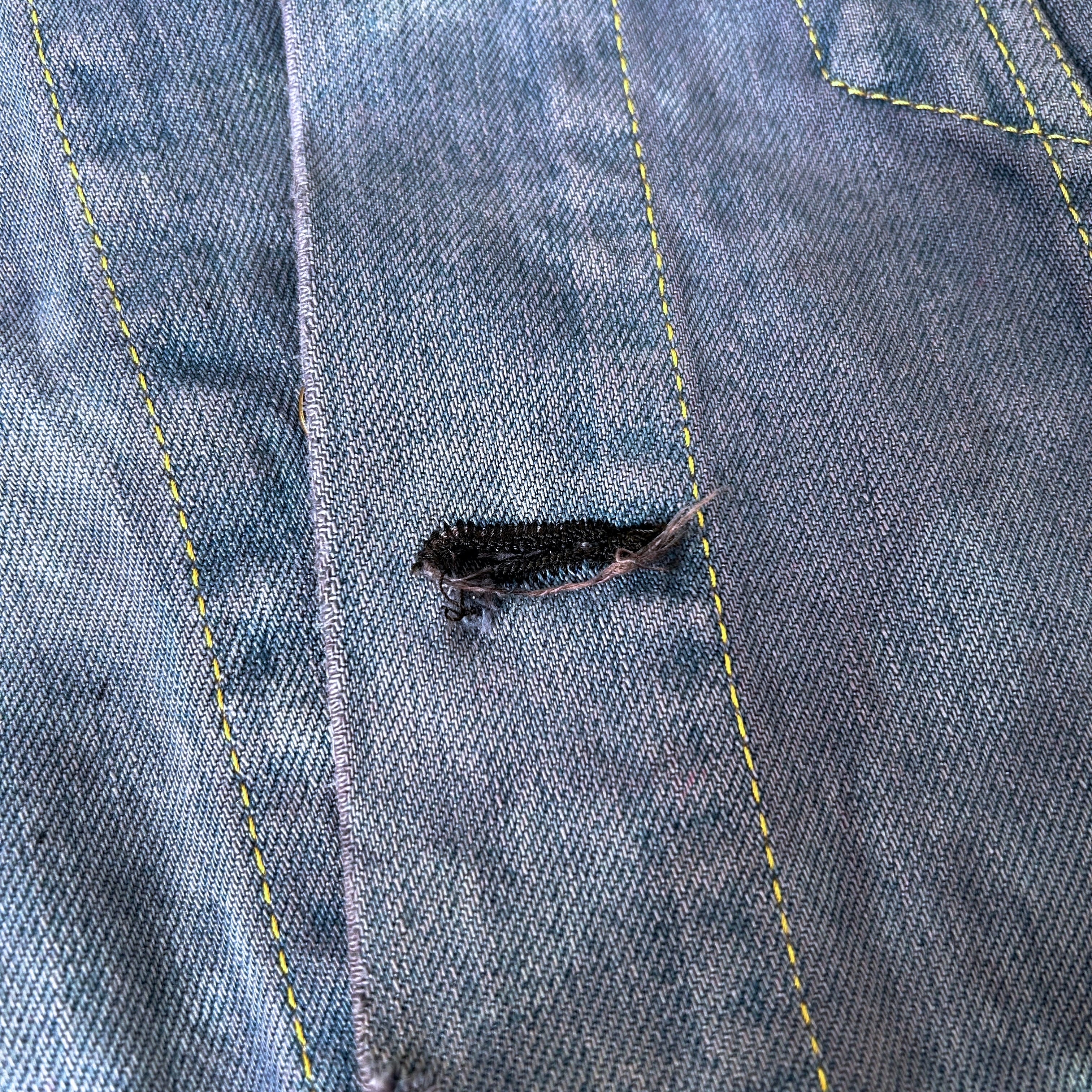 後染めならではの滲みや不均一な風合い、そしてデニムが刻んできたダメージまでもが、この一着にしかない表情を生み出しています。