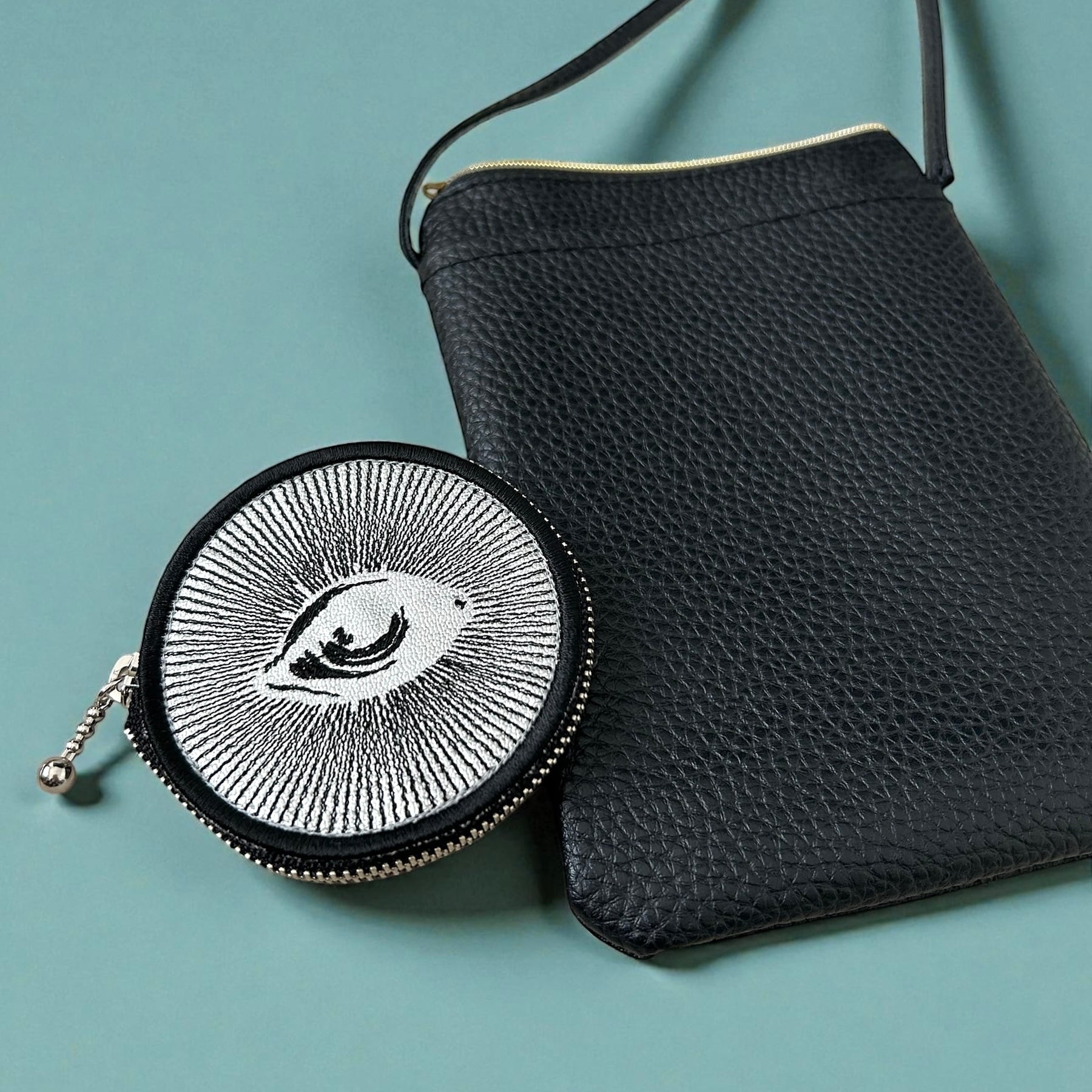 ”MY ICON”ワッペンを使用した、コインやアクセサリー等が入れられる小物入れ。