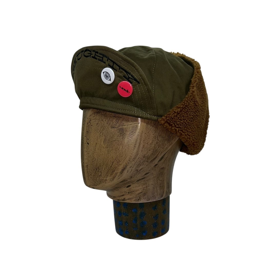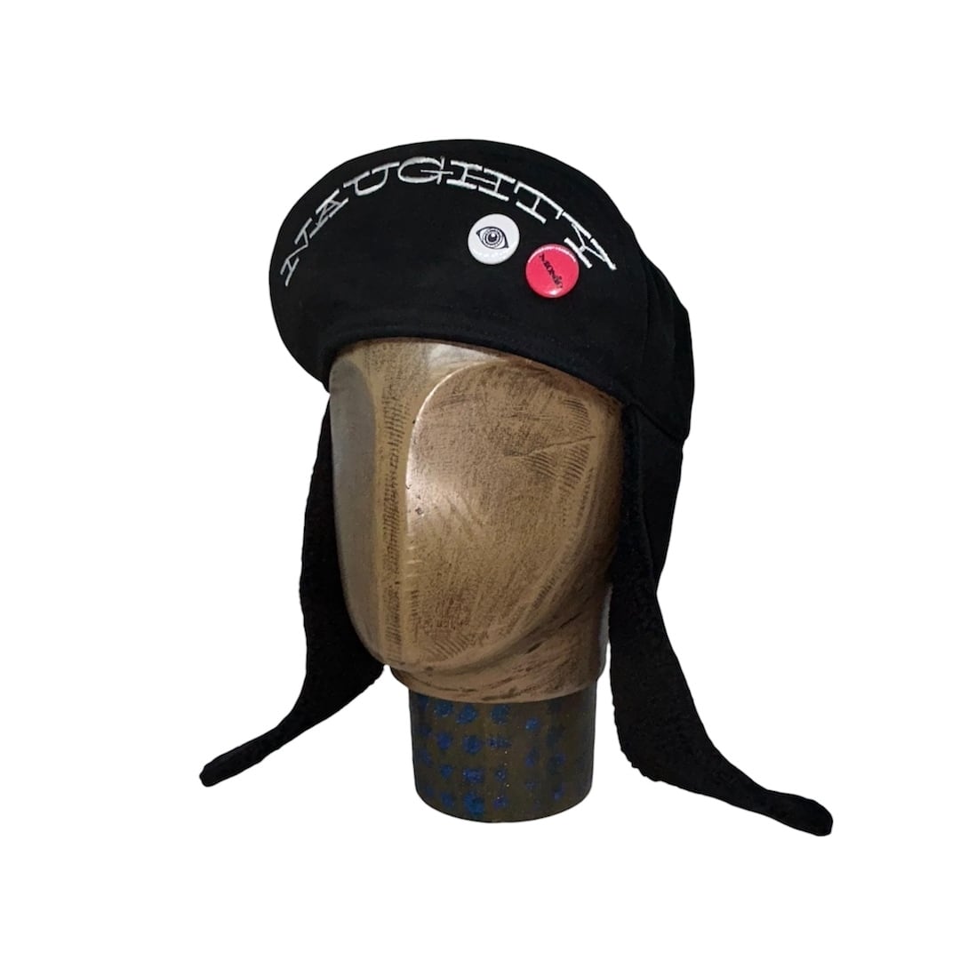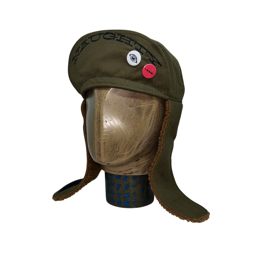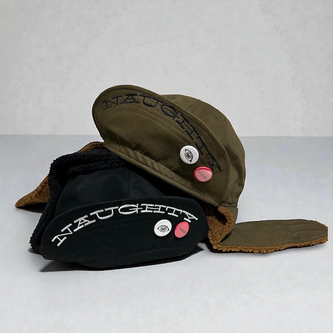 イヤーフラップキャップのバイザーに「NAUGHTY」の刺繍を施し、2つの缶バッジを配したリメイクアイテム。ほどよく主張のあるデザインに仕上げました。