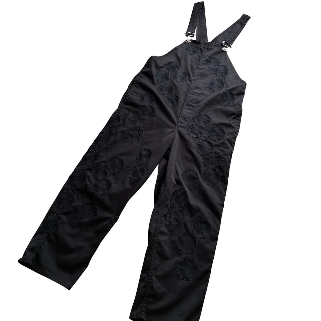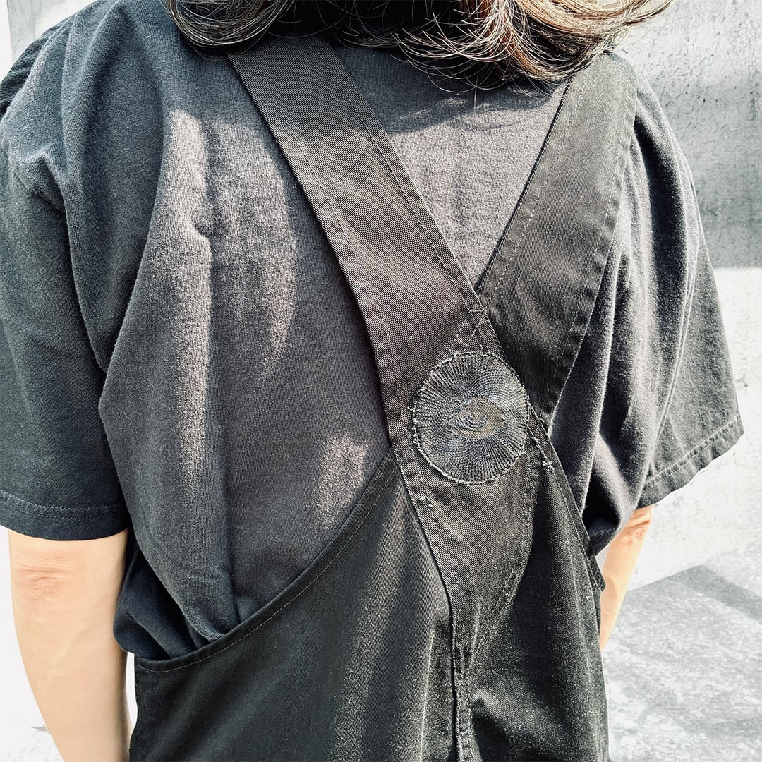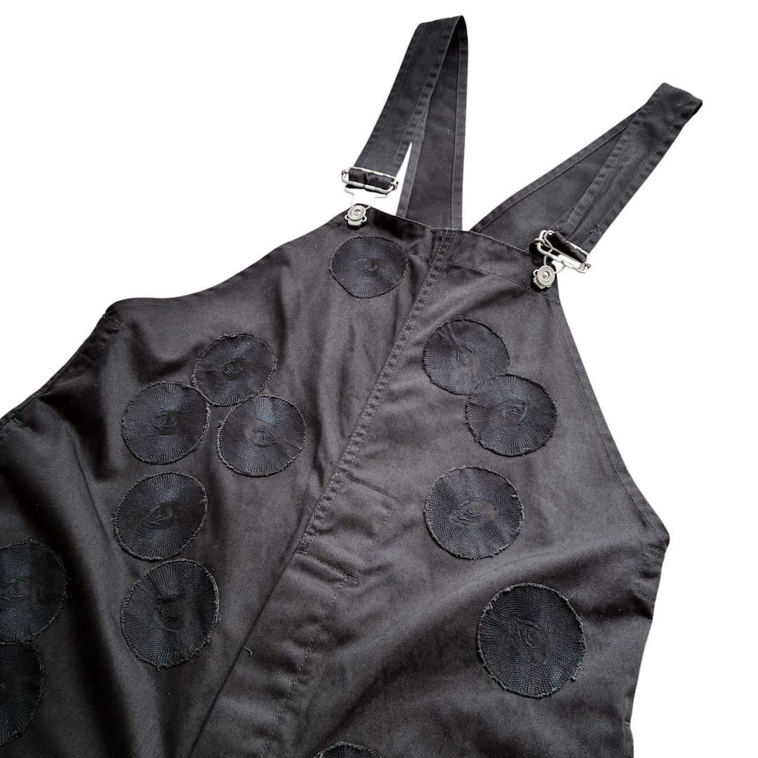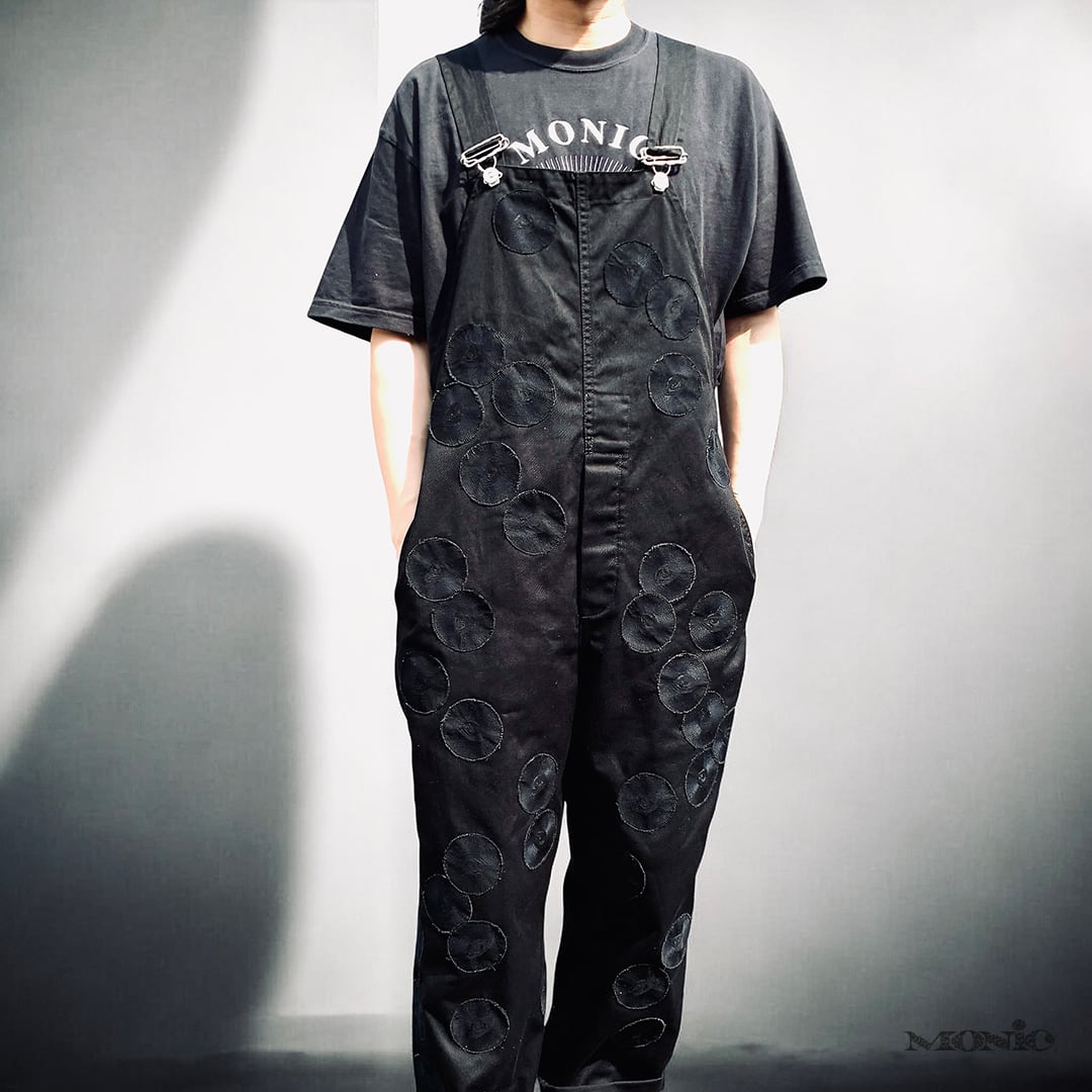 古着のブラックのオーバーオールをベースに、同色のMONIC eyeワッペンを贅沢にレイアウト。