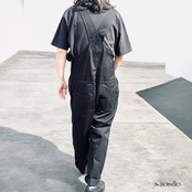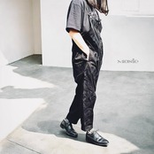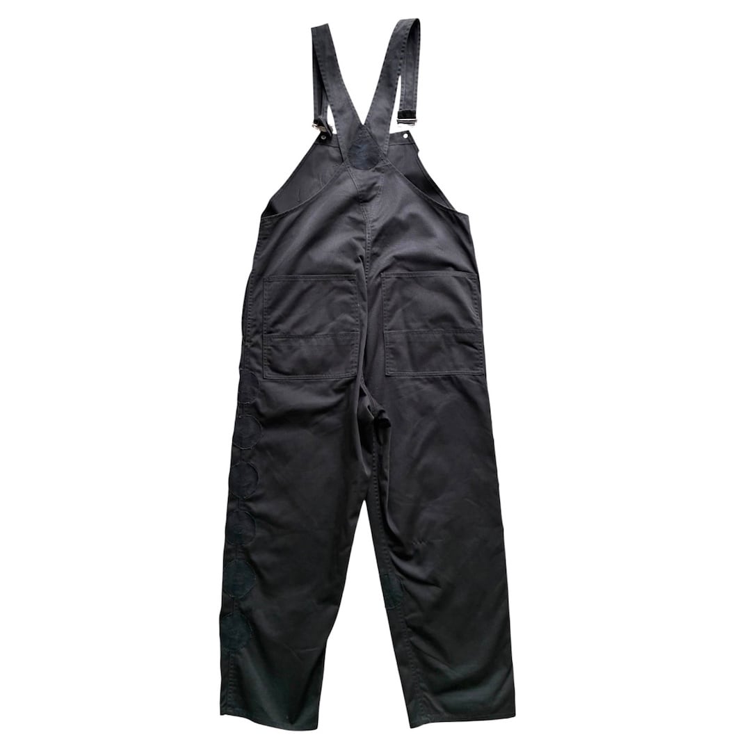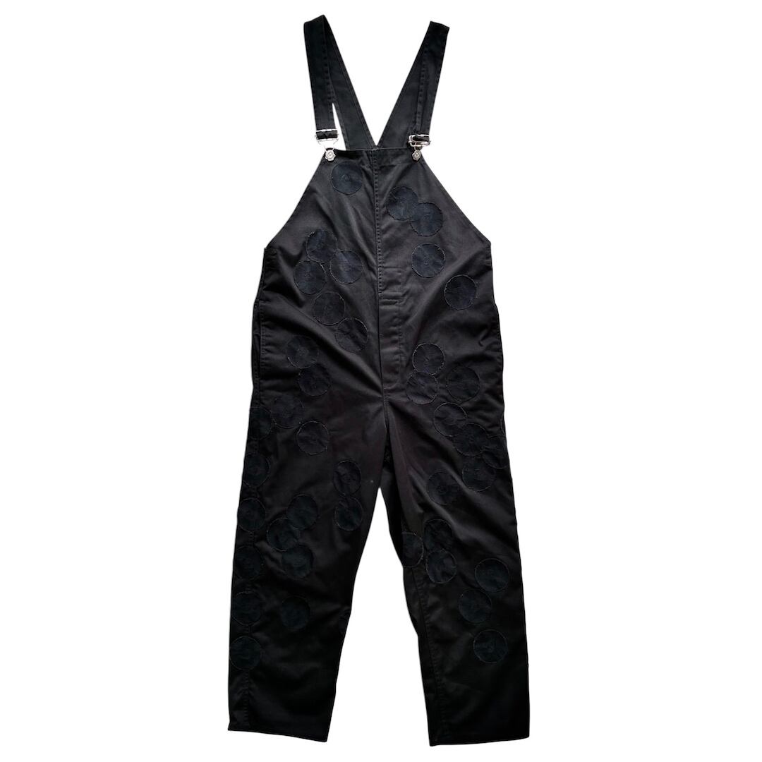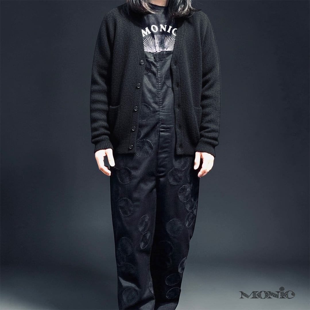 古着のブラックのオーバーオールをベースに、同色のMONIC eyeワッペンを贅沢にレイアウト。