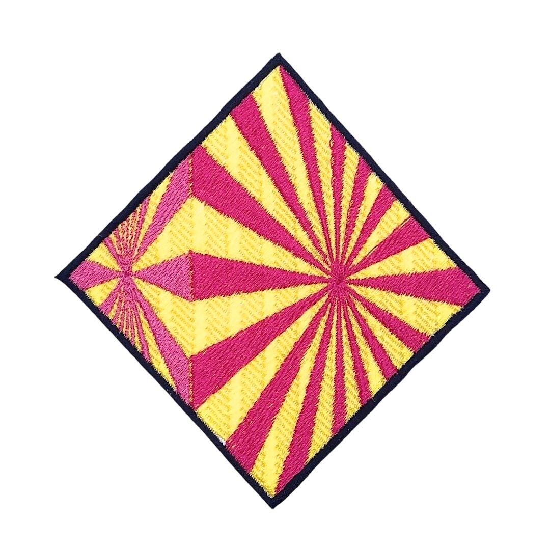 An elaborate patterned patch with a radial design and a vertical pattern on the background.