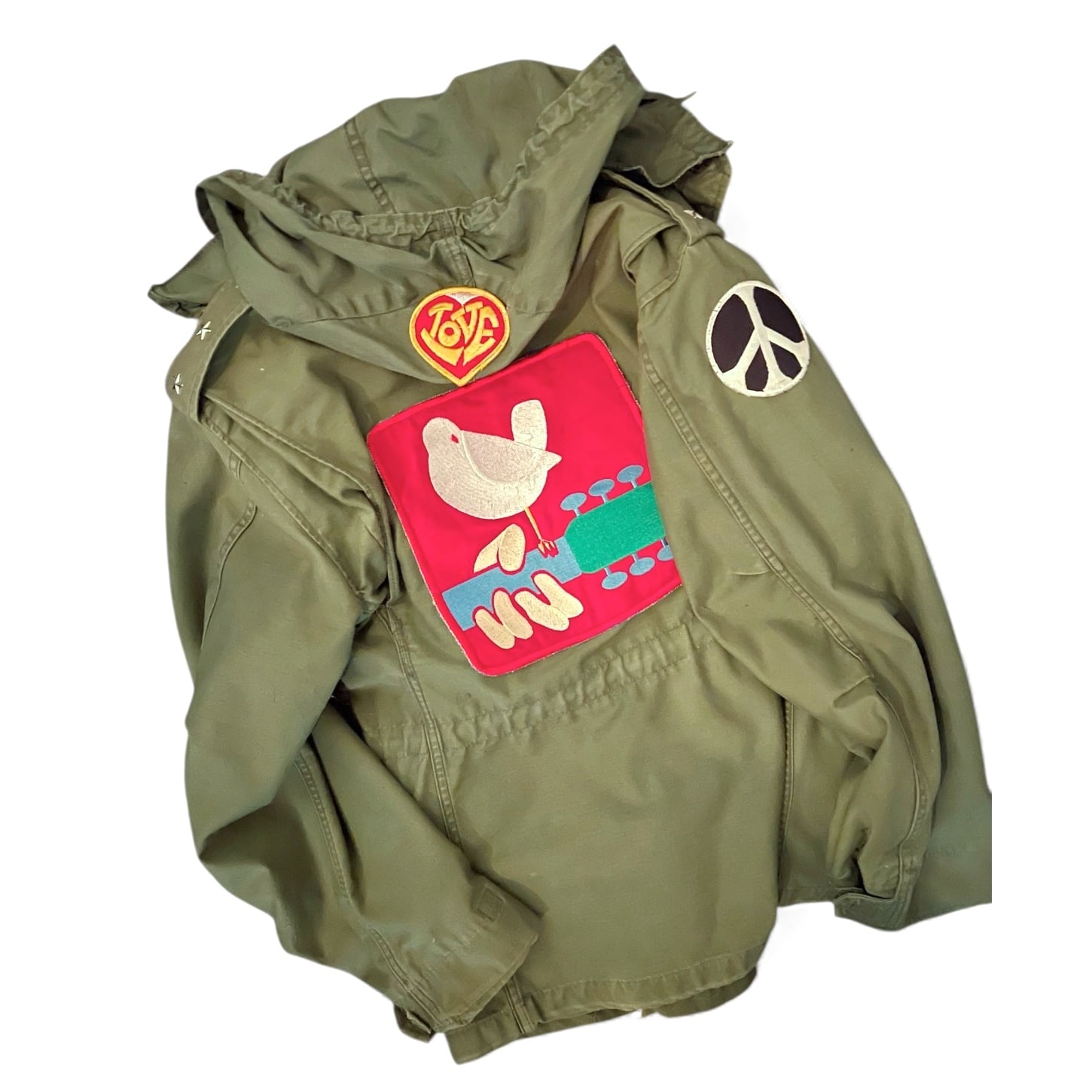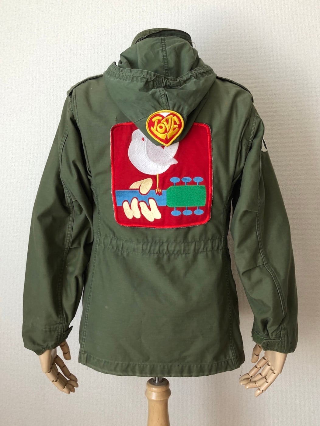 肩にはピースマーク、背面には存在感抜群のウッドストック特大ワッペン、