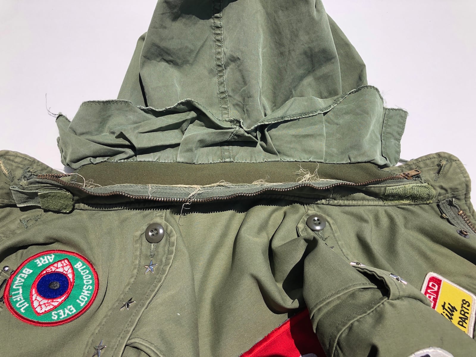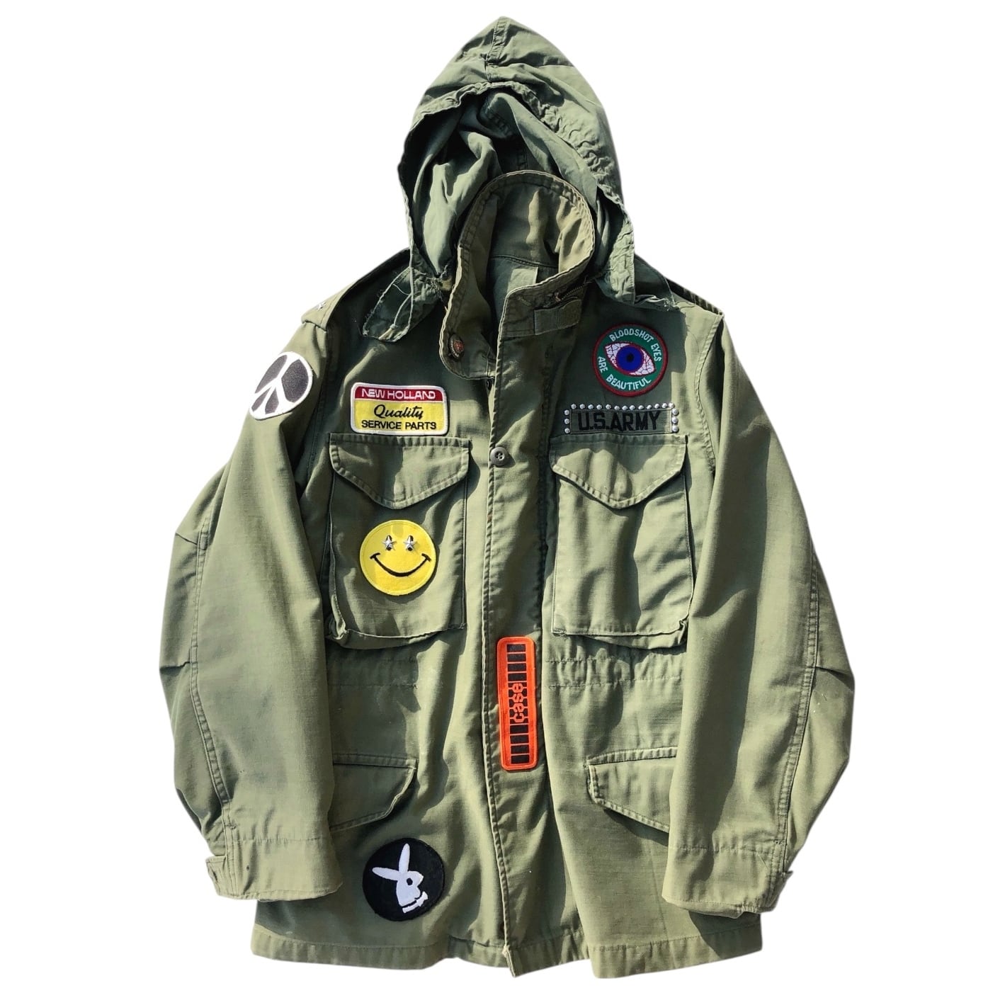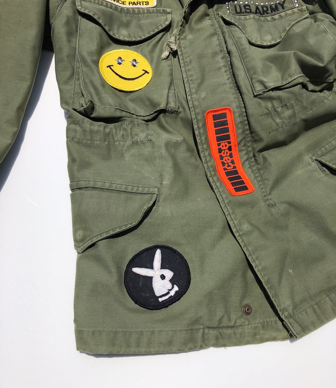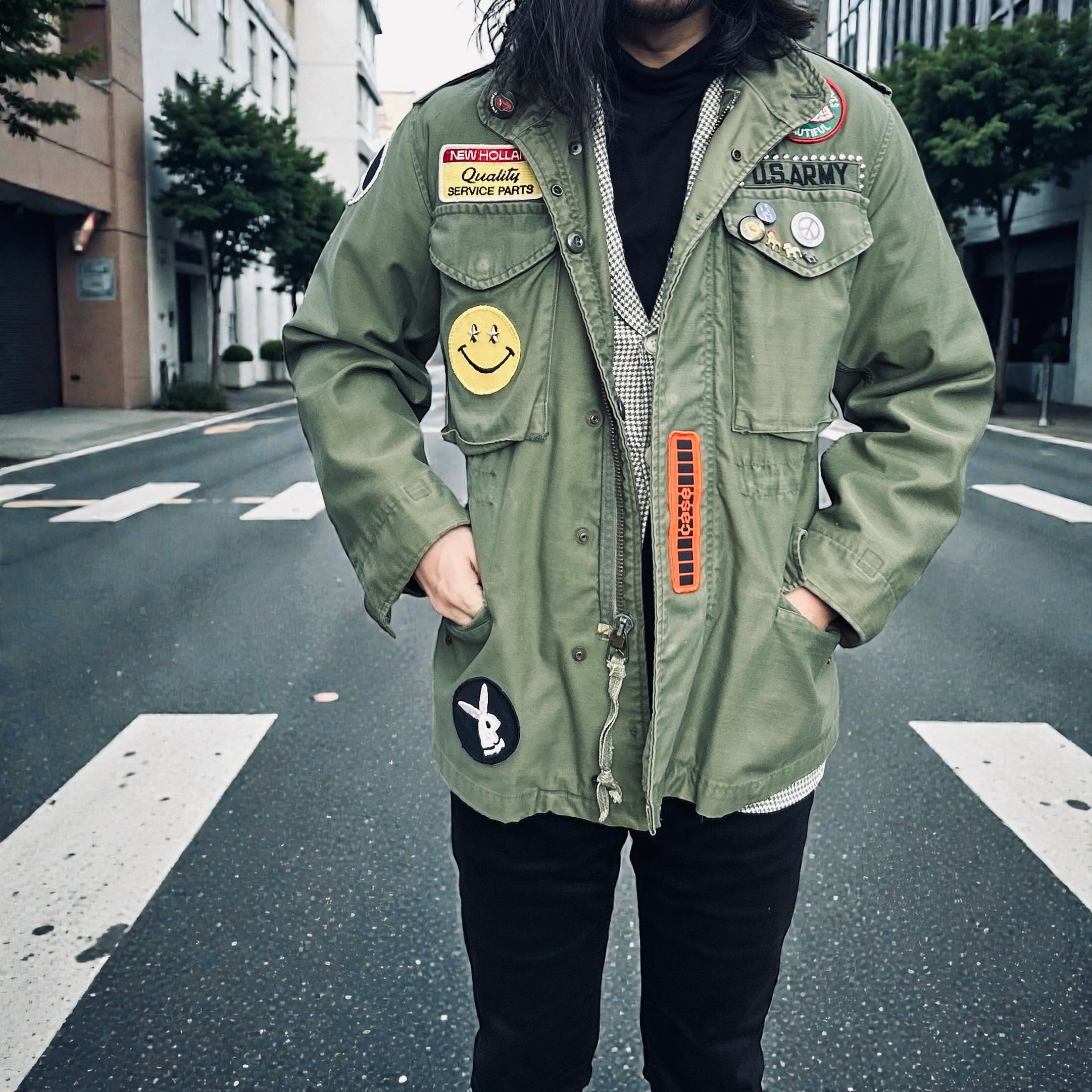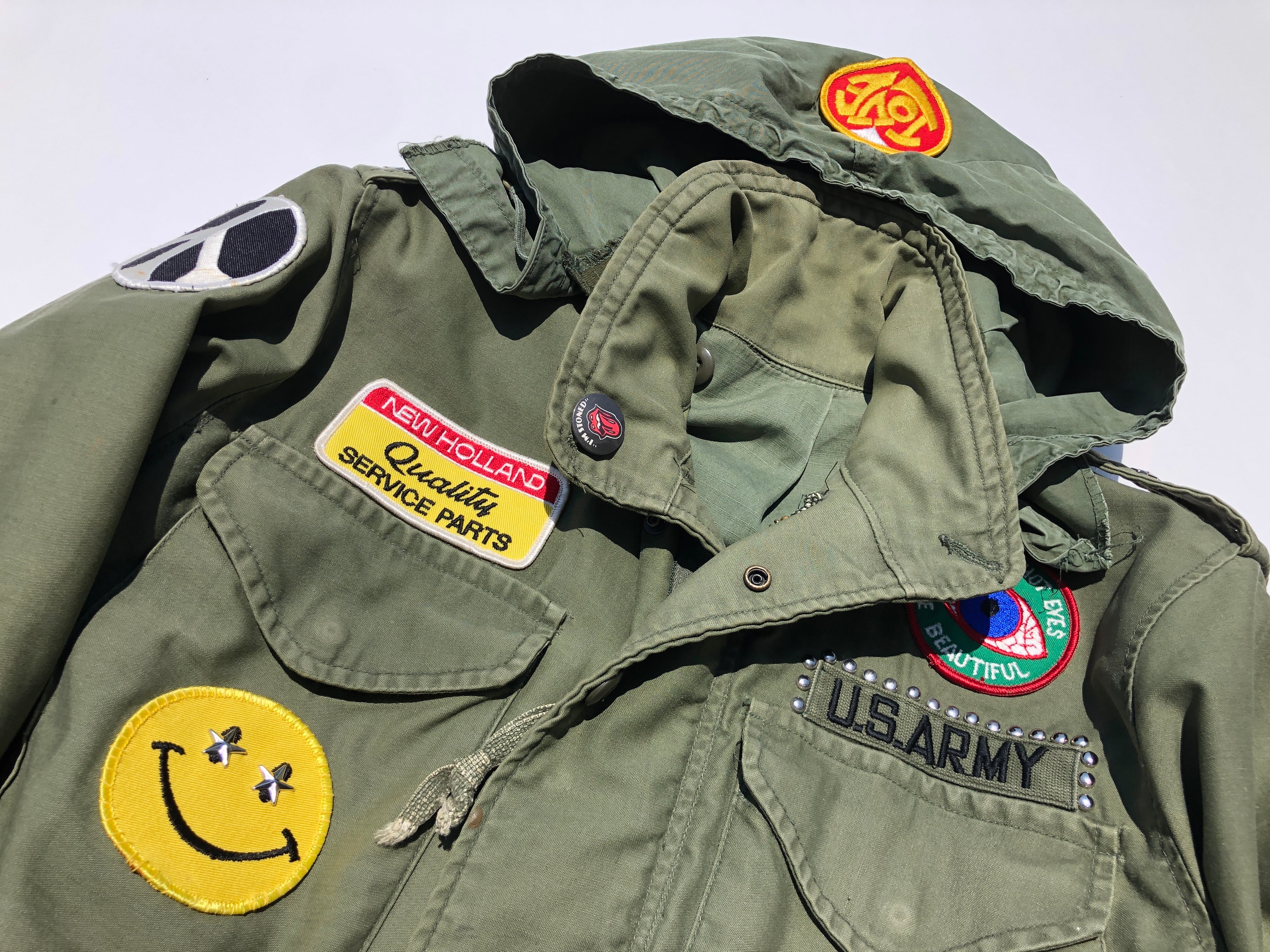 70sカルチャーの空気感をそのまま閉じ込めた、ワッペン&スタッズ仕様の1点物ビンテージ M-65 カスタムジャケットです。