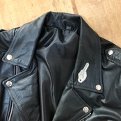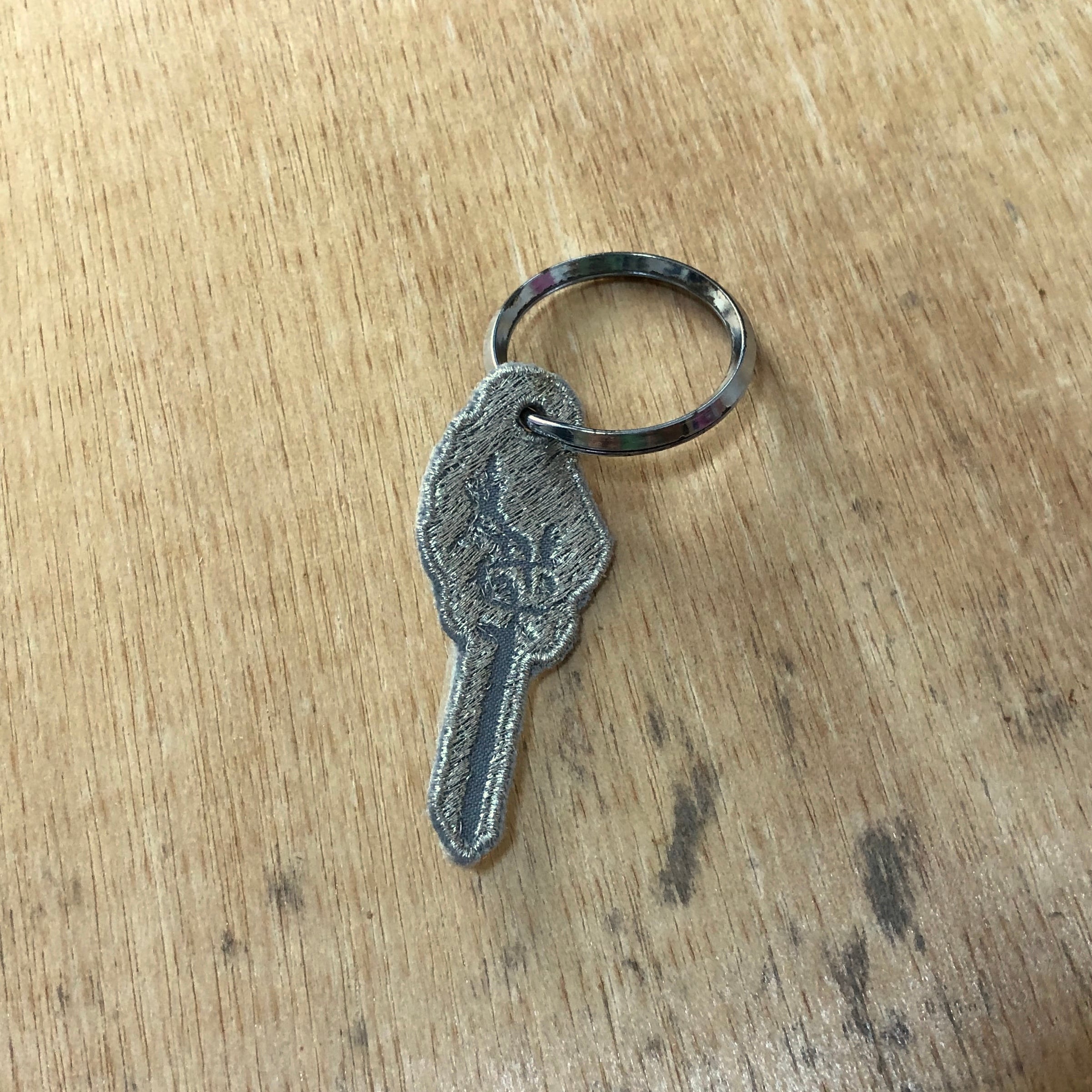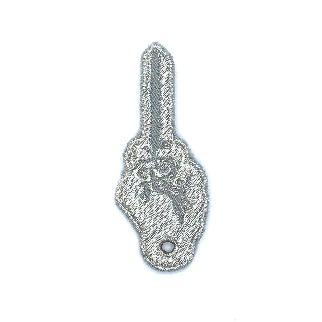 中指を立てた鍵風ワッペンです。特殊カラーのシルバー糸を使いました。