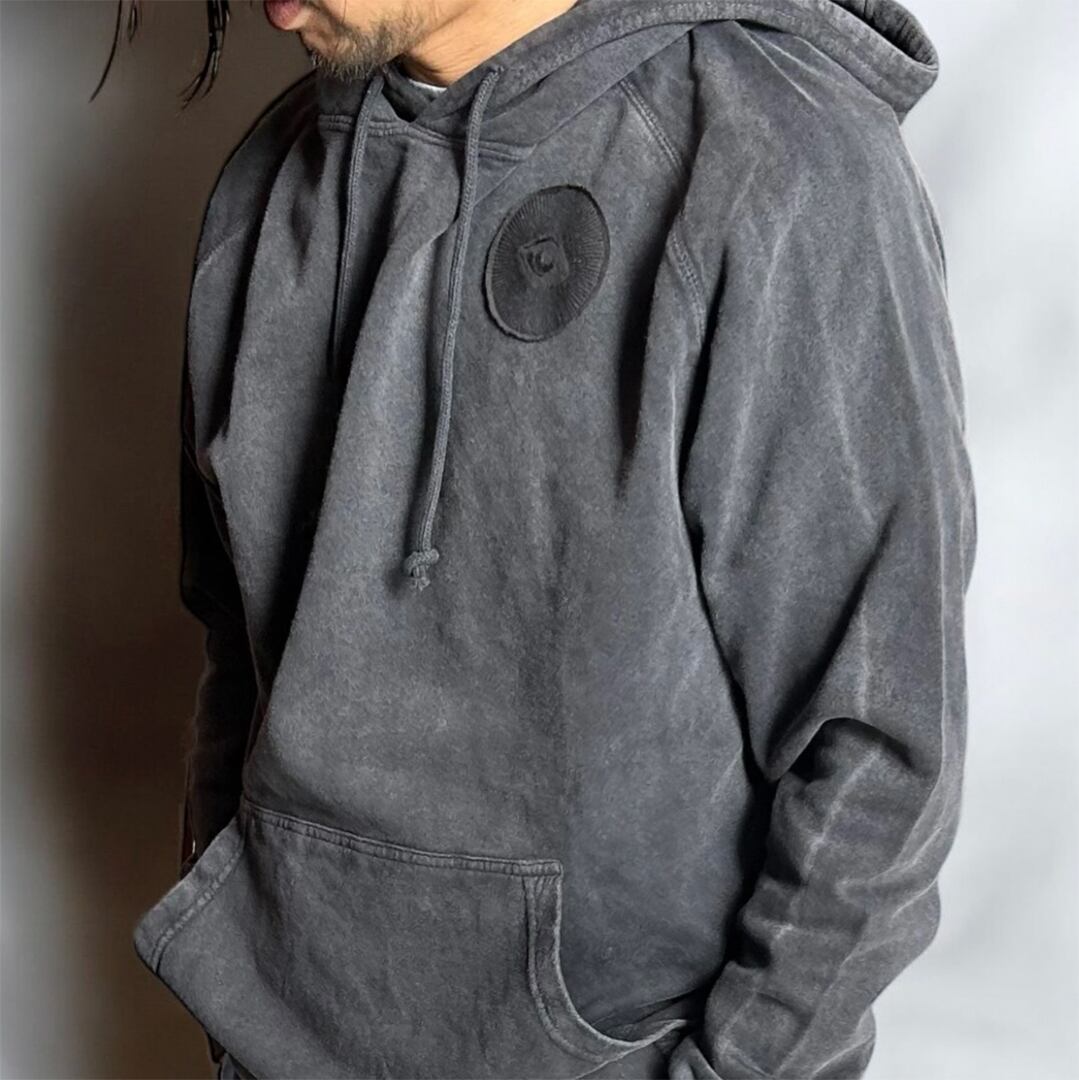 通常の胸の位置よりも、顔に近い場所に位置していますので、よりワッペンのデザインが際立ちます。際立ちながらも、ボディと同色のブラックカラーワッペンですので主張しすぎず、上手く足し算引き算されたデザインのパーカーとなっております。